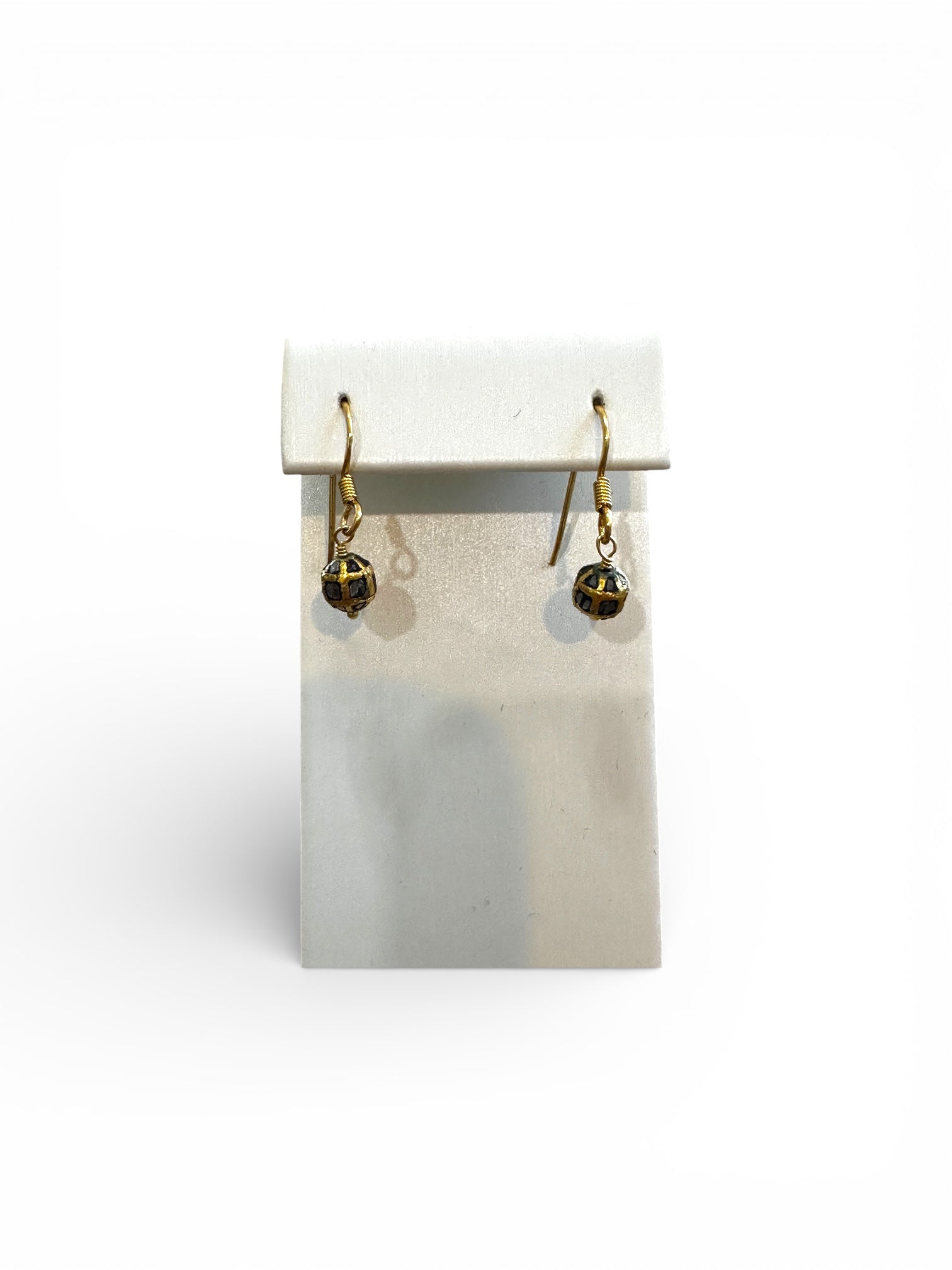 Black diamonds form a petite, spherical globe encircled by 18k gold bands, creating a striking contrast of light and depth. Suspended from a polished gold fishhook, these earrings offer a sharp, modern edge—effortless for everyday wear, yet distinctive enough to feel unexpected.
