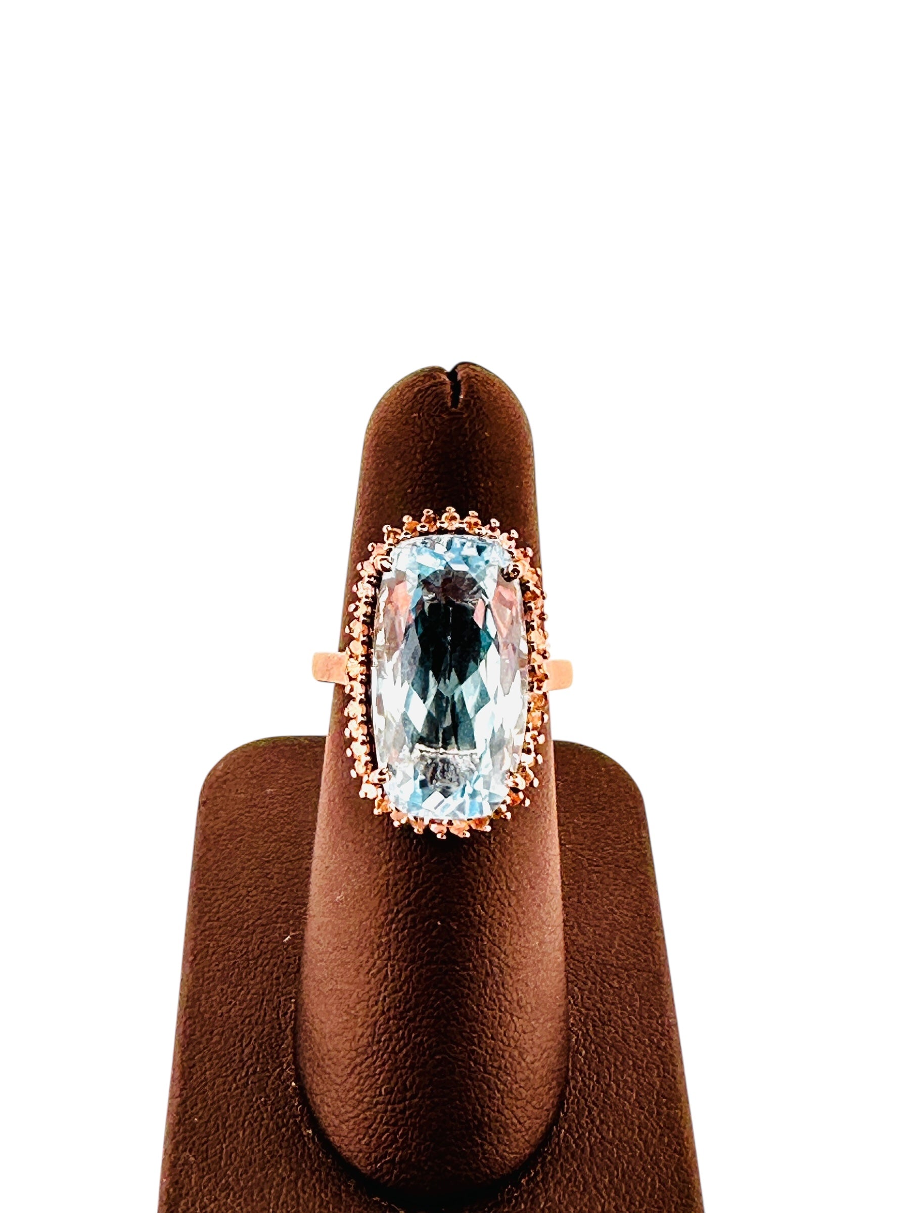 A striking 20 ct rectangle brillant-cut Blue Topaz, haloed by Diamonds (.9 ct). Set in Sterling Silver with Black Rhodium overlay, this ring glows with brilliance and modern sophistication.