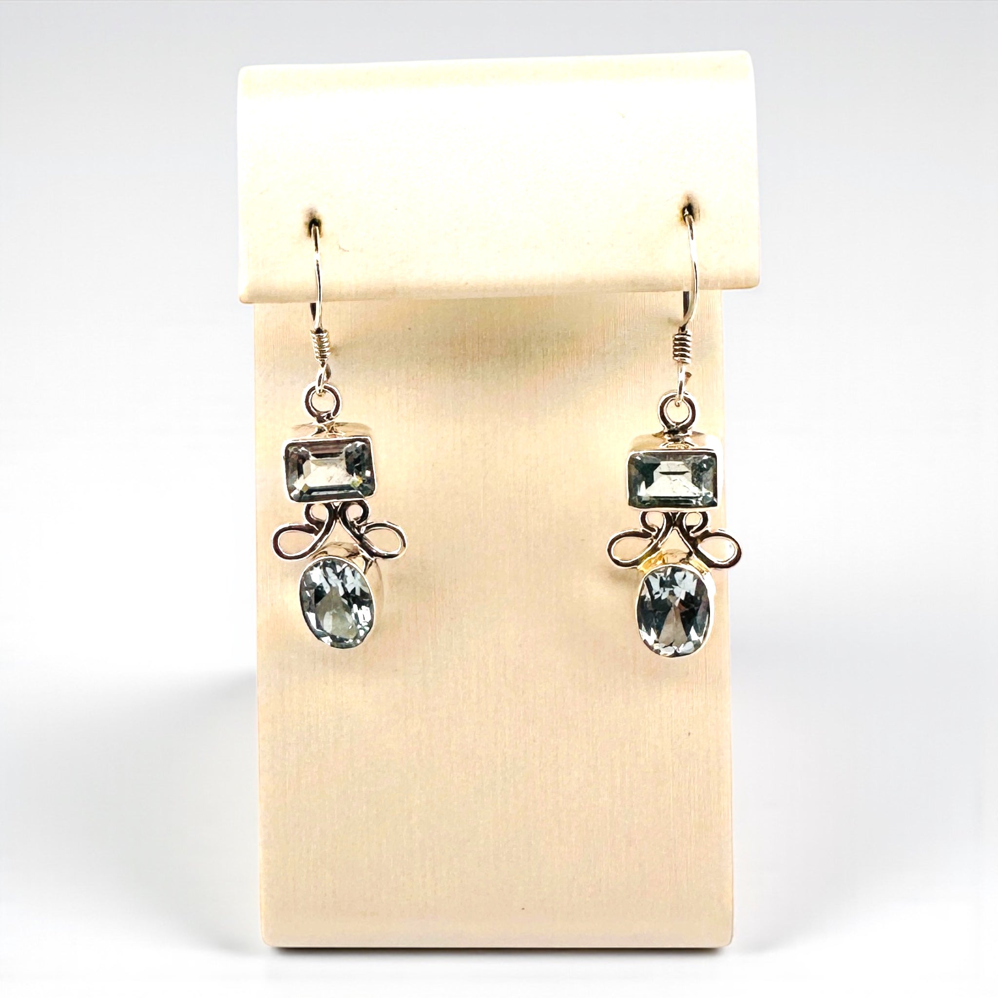 Emerald- and round-cut Blue Topaz stones set in a graceful Sterling Silver swirl design. Dangling elegance with endless sparkle.