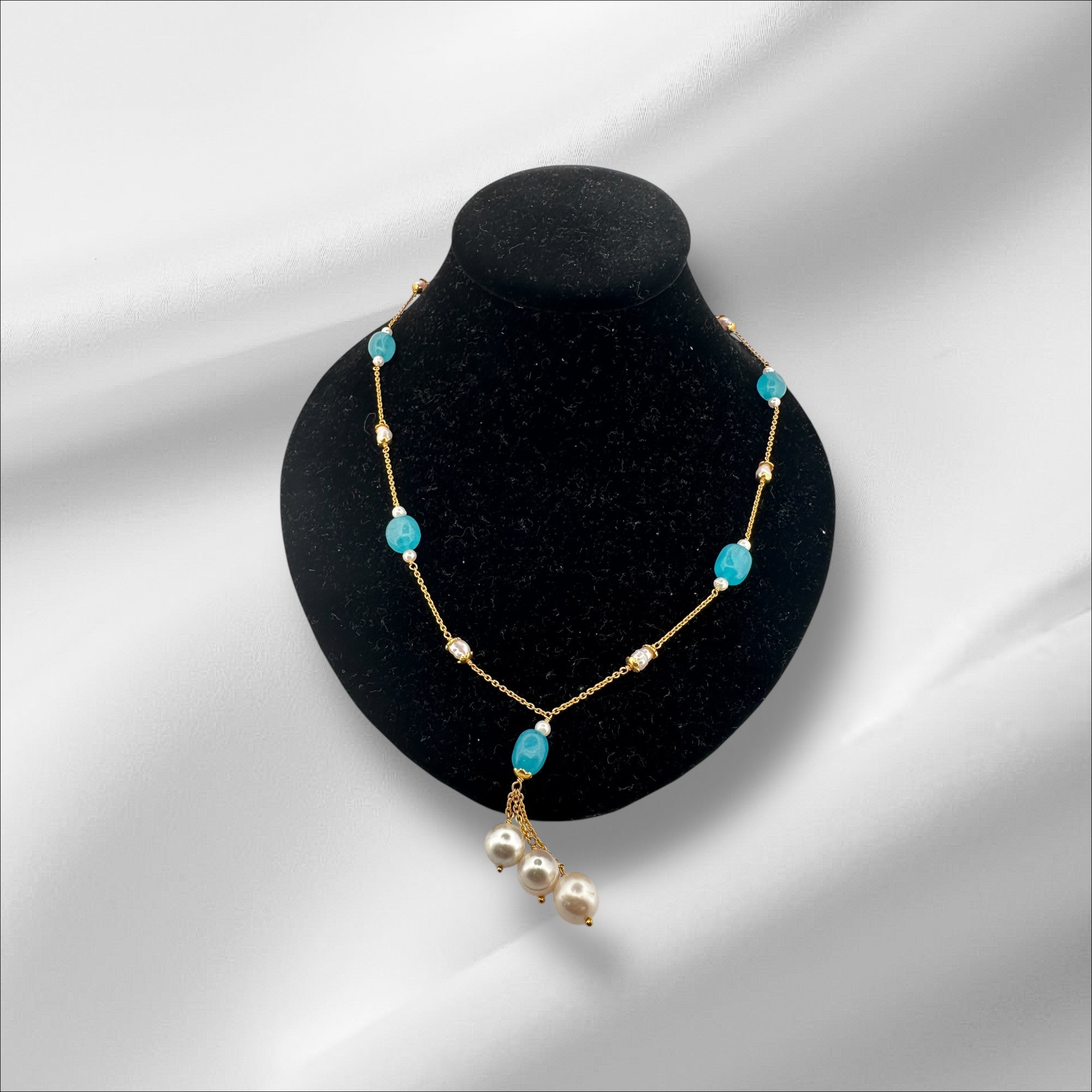 Chalcedony gems accented with delicate seed Pearls and Baroque Pearls encased in floral caps. Three 10 mm Pearls dangle gracefully, suspended from a Sterling Silver chain with 18k Gold Overlay. A luminous statement of elegance and artistry.