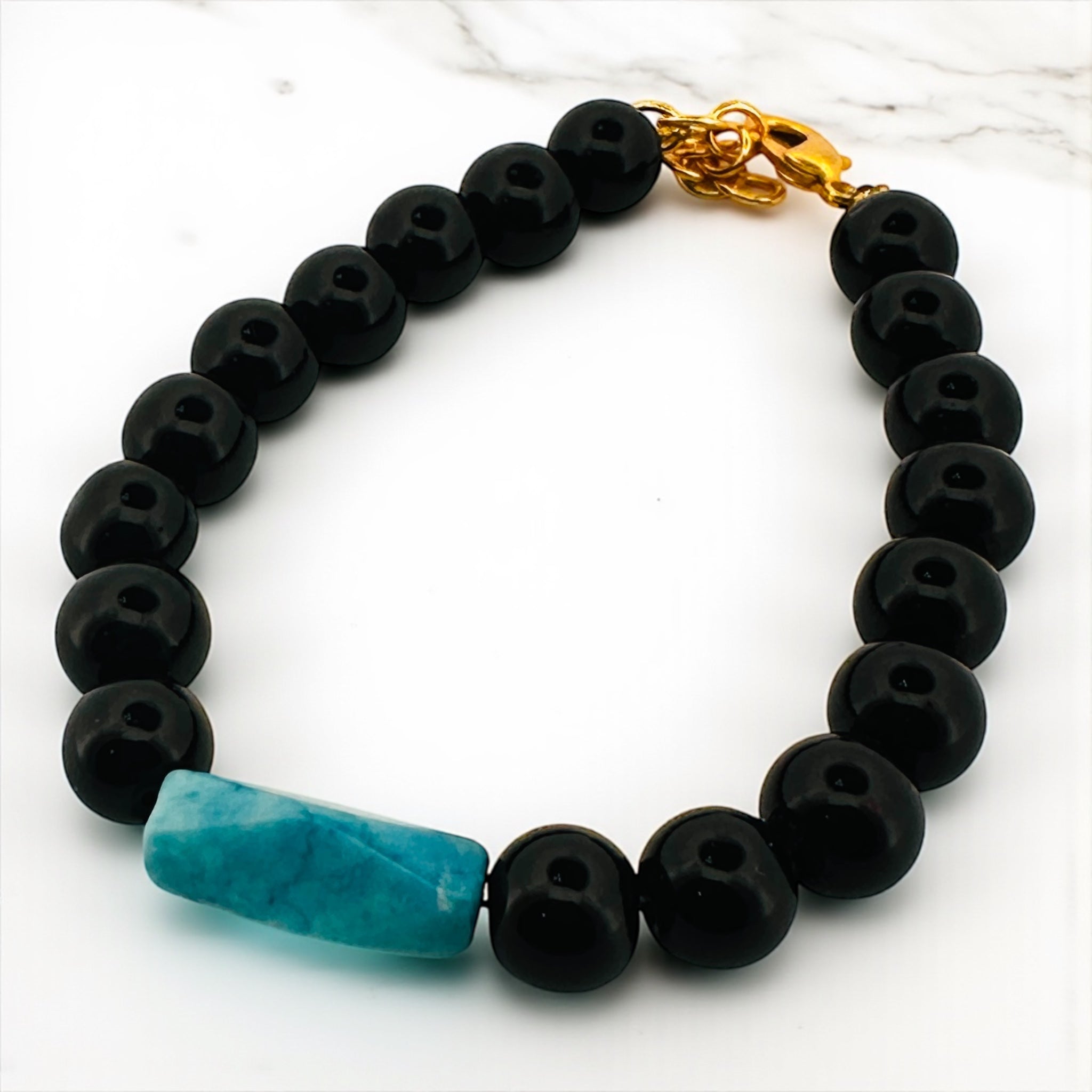Deep Black Onyx beads accent one Turquoise bead —an elegant balance of bold and serene.