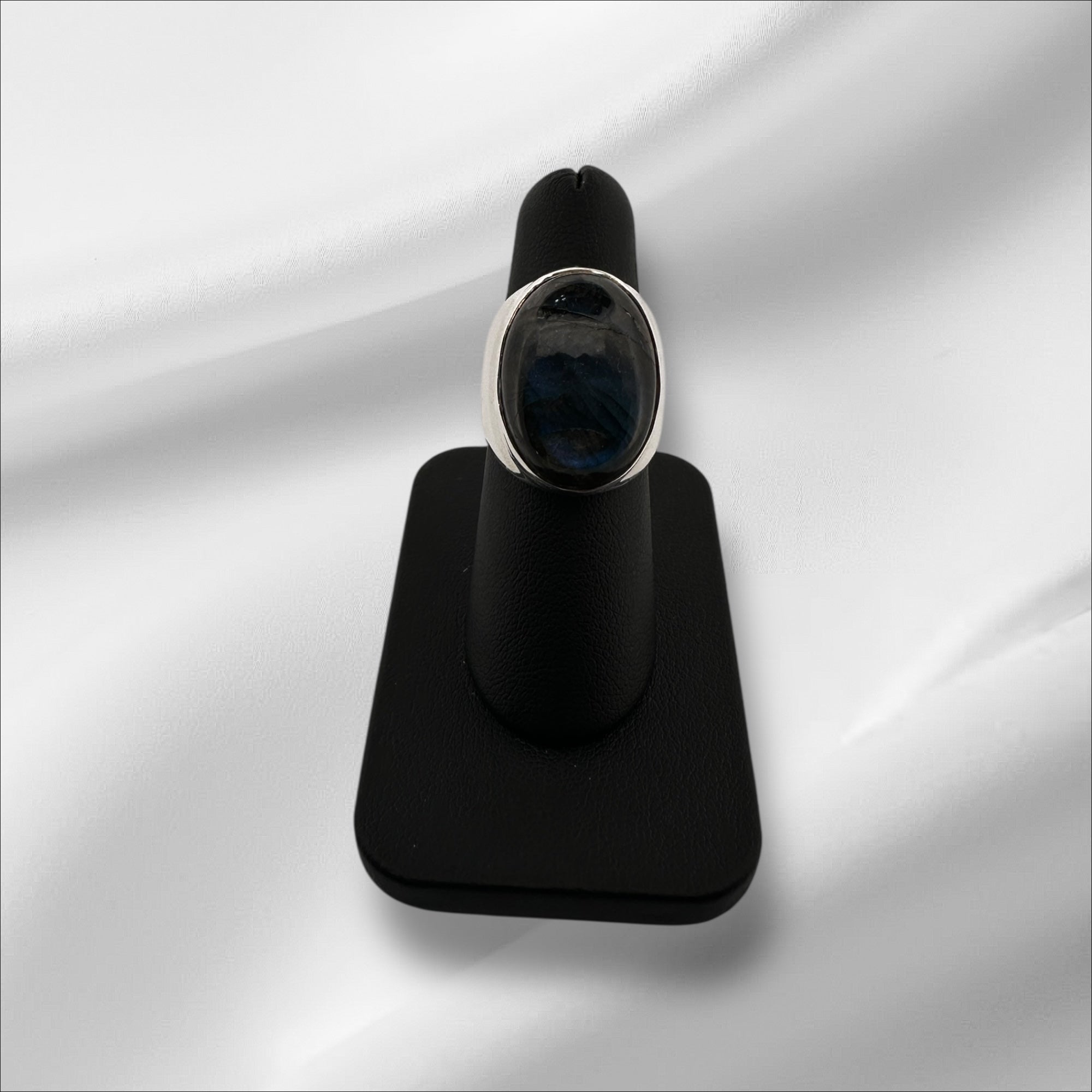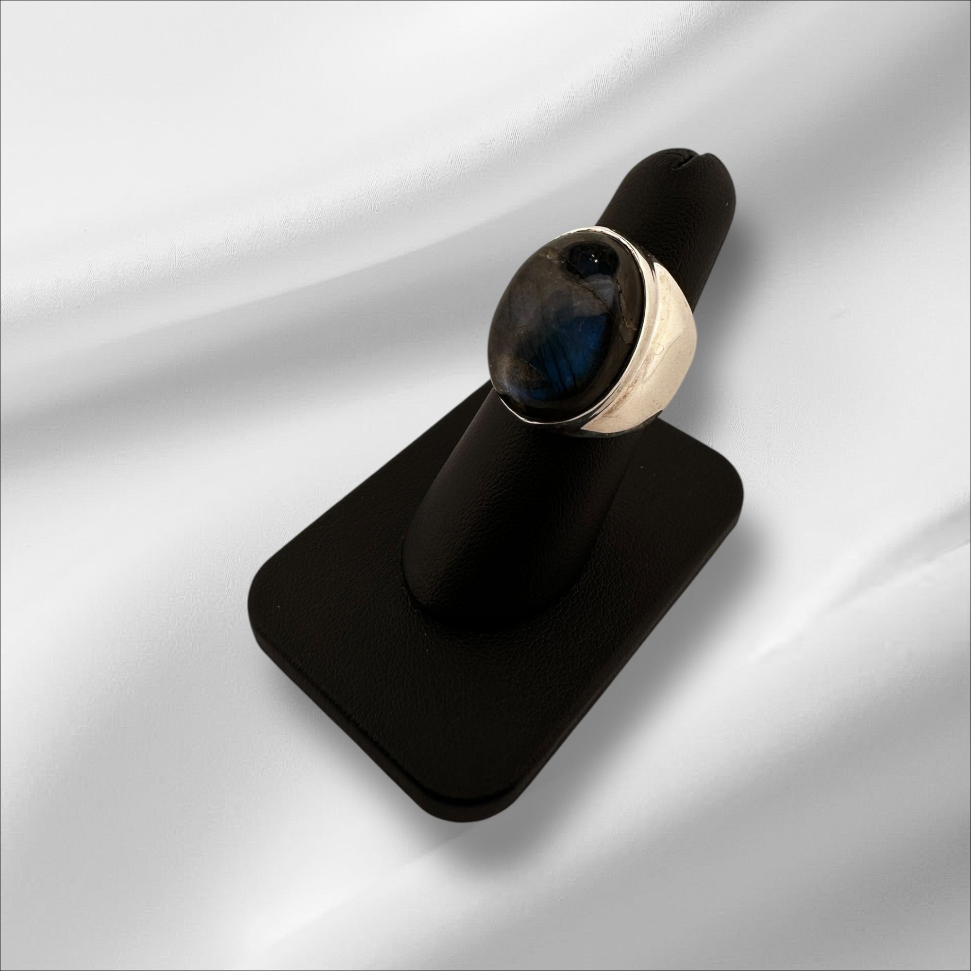 A striking large labradorite cabochon set in Sterling Silver. Its iridescent play of color shimmers with mystery and elegance.