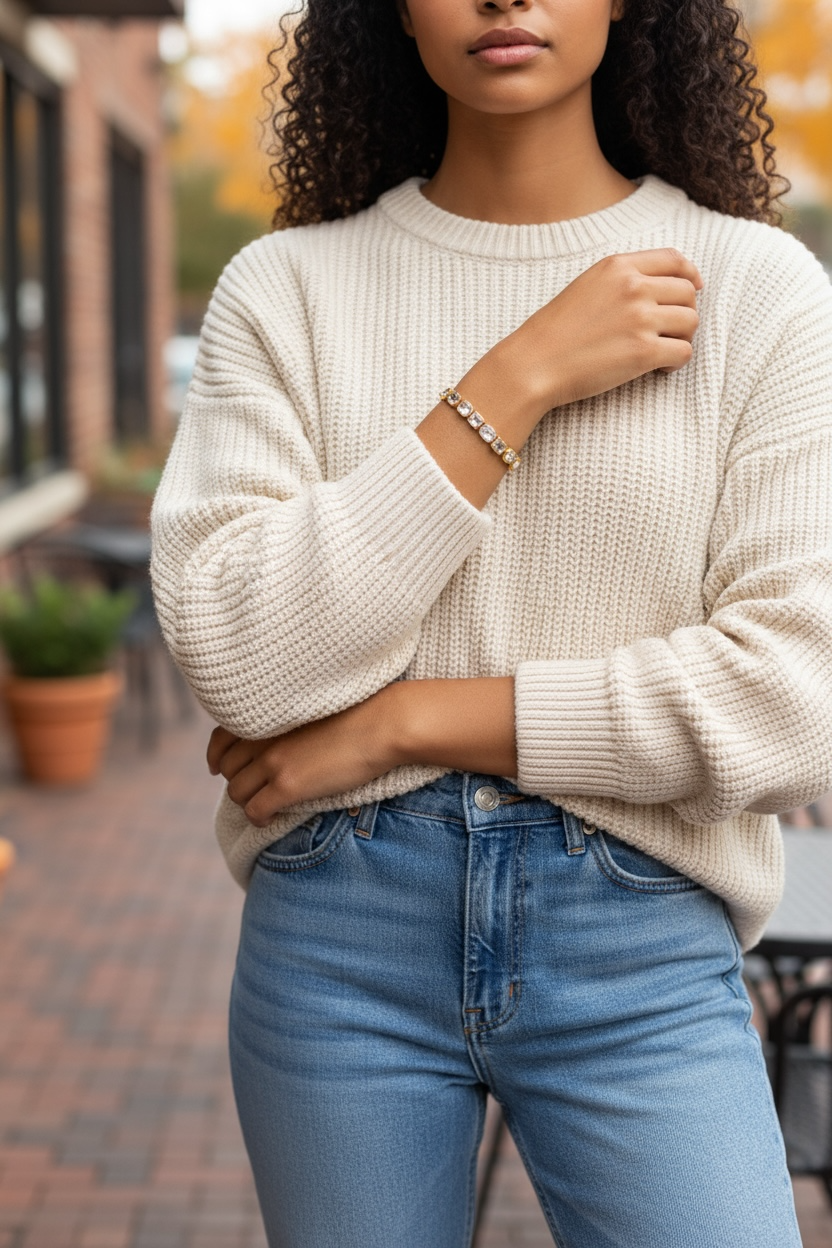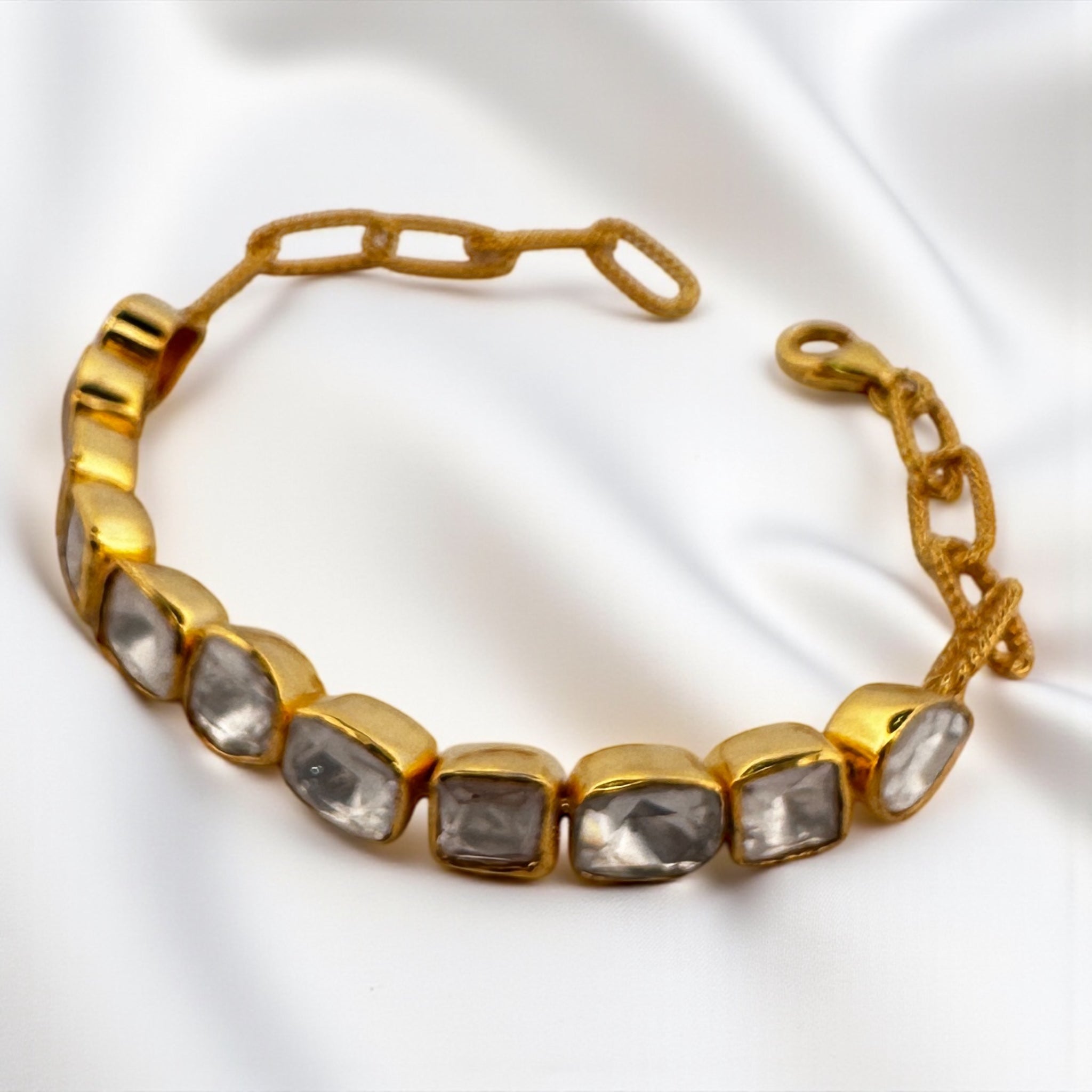 A refined strand of 11 square-cut Moissnaites, bezel set and linked with a rope-design paperclip chain. Finished in Sterling Silver with 18k Gold Overlay and a secure lobster clasp (7½"). Sparkling, elegant, and modern.