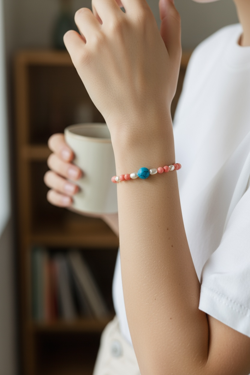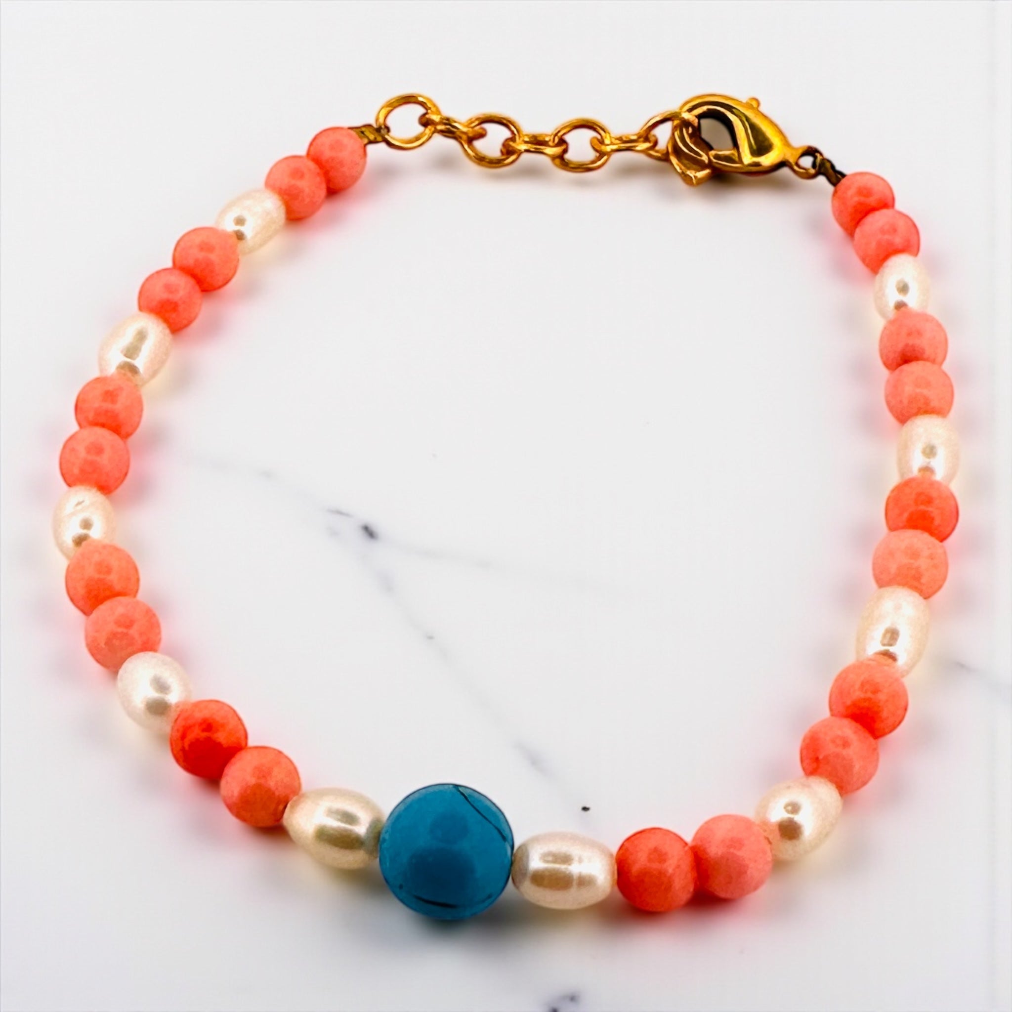 A bold, eclectic mix of Coral, Baroque Pearls, and Turquoise beads—capturing the spirit of Jaipur’s colorful bazaars in one radiant piece.