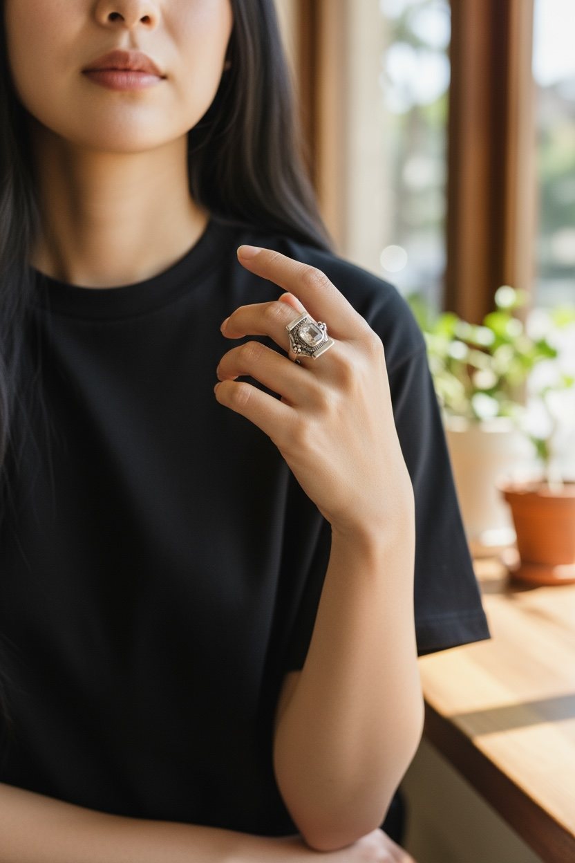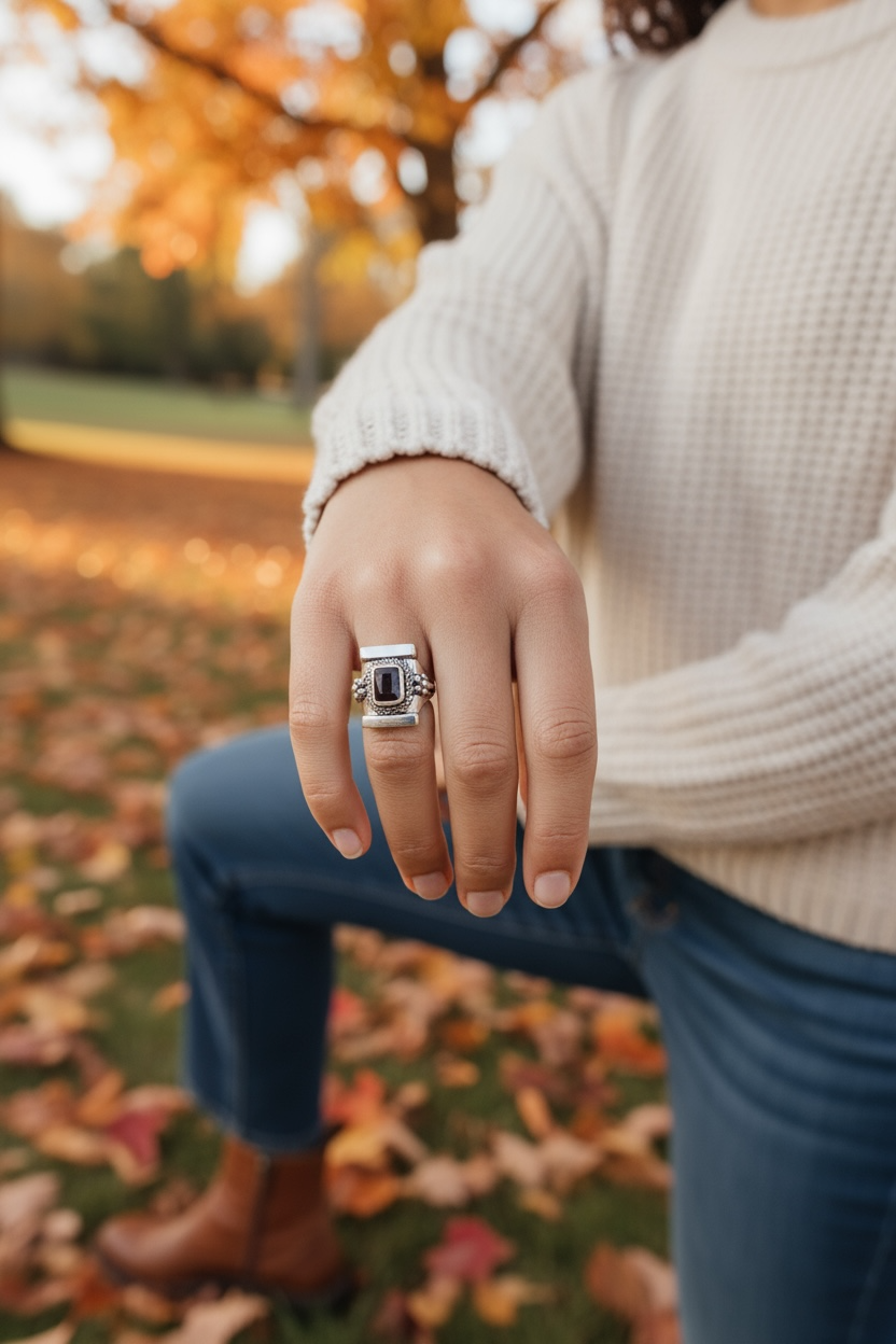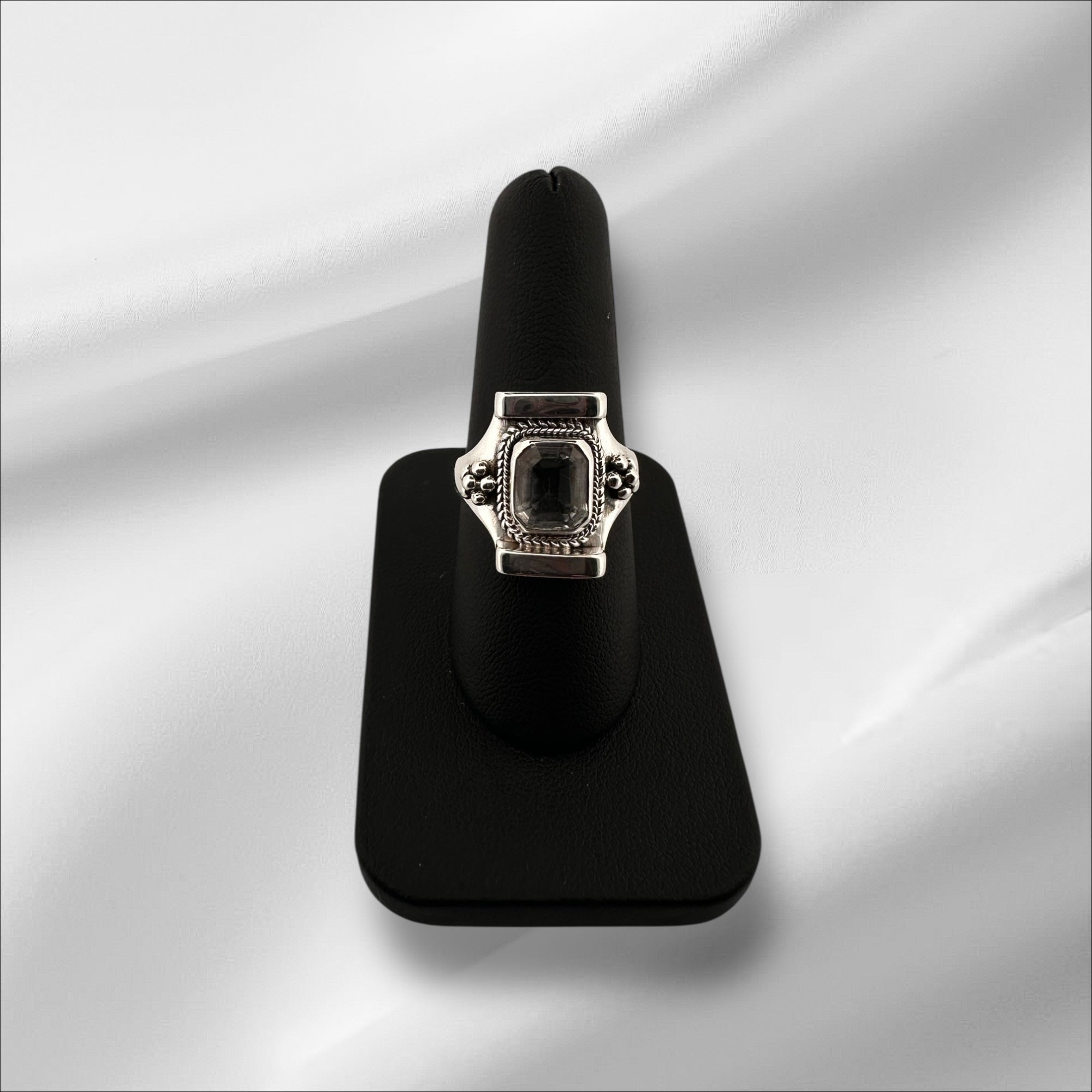 A nod to traditional Indian design, this ring features an Emerald-cut Garnet or light Amethyst in Sterling Silver. Heritage meets timeless beauty.