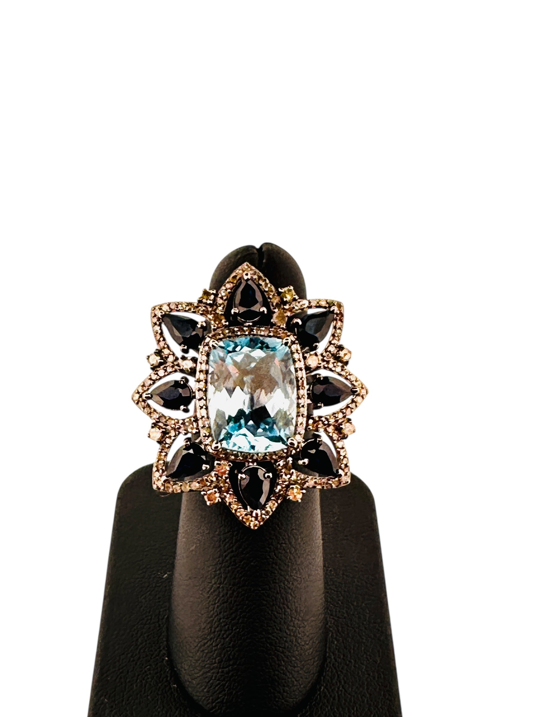 An exquisite 12 ct brilliant-cut Blue Topaz with 4 tcw pear-shaped Sapphires and 2 ct Diamonds, arranged in a starburst pattern. Finished with Black Rhodium overlay for a dramatic Victorian-inspired effect.